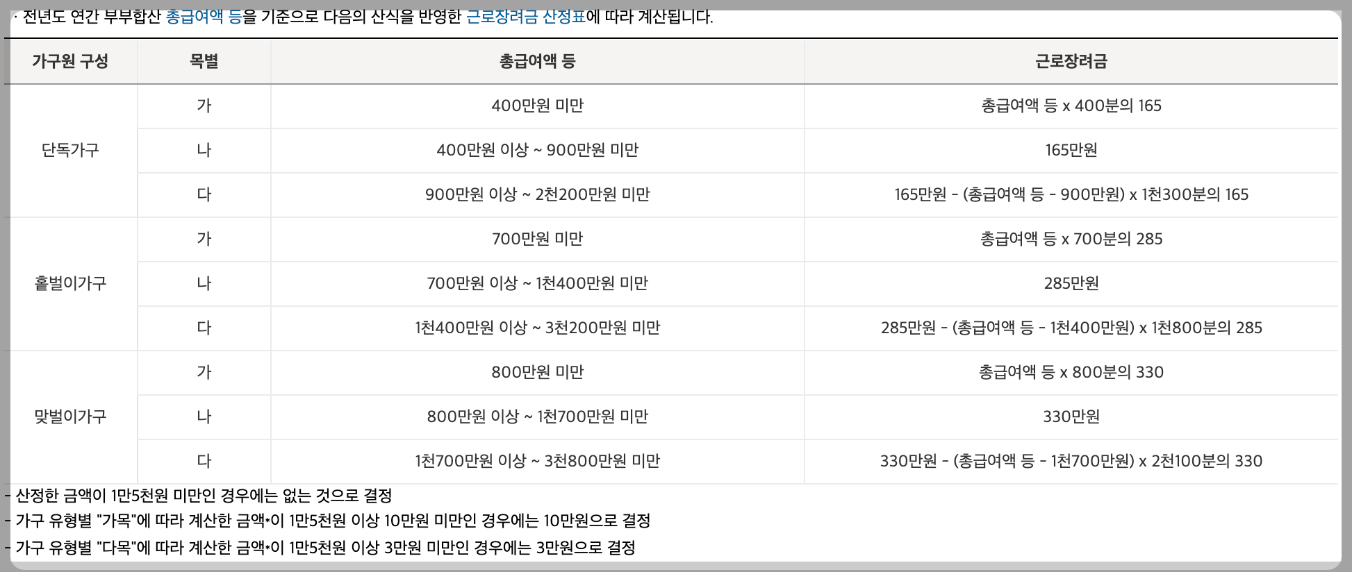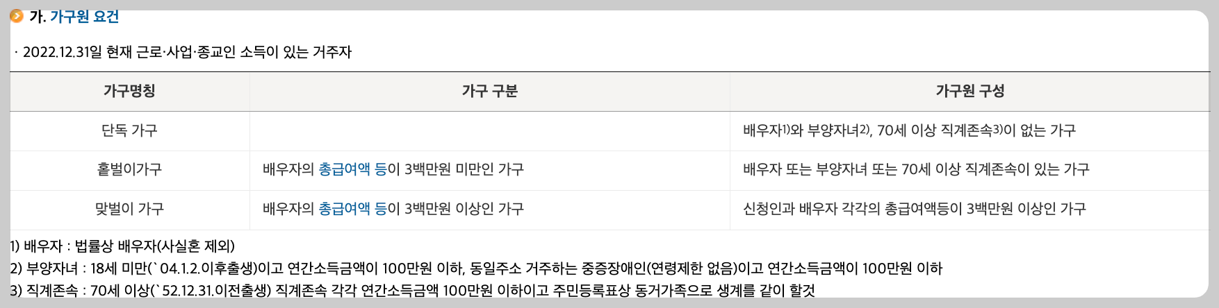가구원 구성에 따라 총급여액 조건 기준도 달라집니다.