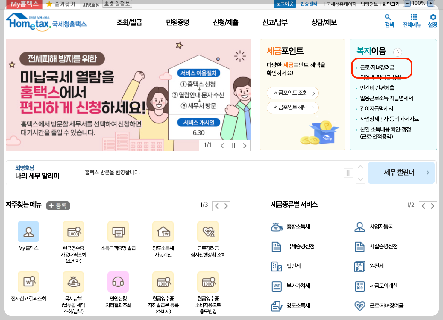 우측 상단에 복지이음 보이시죠? 바로 밑에 근로·자녀장려금 눌러주세요. 찾으셨죠?
