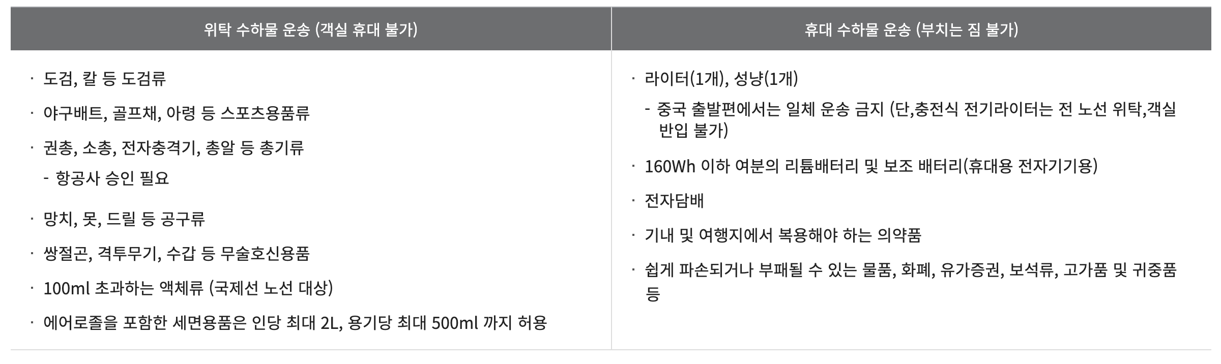 - 여분의 리튬배터리(보조배터리), 전자담배, 라이터는 부치는 짐으로 운송 불가, 휴대하여 객실 반입만 허용 (단, 충전식 전기라이터는 전 노선 위탁, 객실 반입 불가)