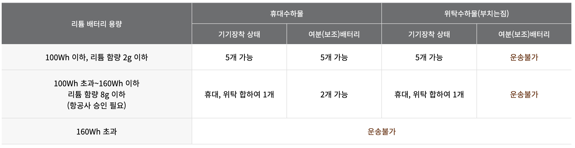 더 밑으로 스크롤 내려가시면 휴대용 일반 전자기기의 리튬 배터리 허용기준 등 자세히 기술되어 있으니 참고하세요.