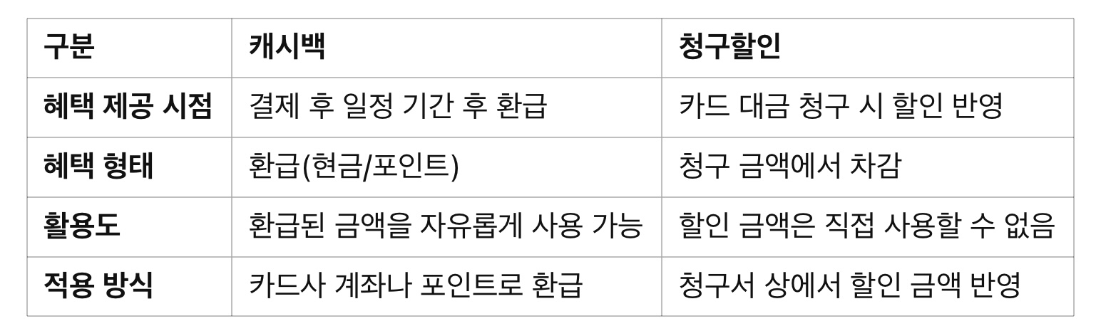 캐시백과 청구할인의 차이는 소비자가 구매 후 혜택을 받는 방식에 따라 나뉩니다. 두 가지 모두 소비자가 구매 시 할인 혜택을 제공하는 방법이지만, 적용 방식과 시점에서 차이가 있습니다.